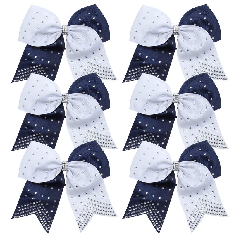 8 Inch 2 Colors Cheerleader Bows Ponytail Holder with Bling Fling Rhinestones Hair Tie Cheerleading Bows 6 Pcs (Navy Blue/White)