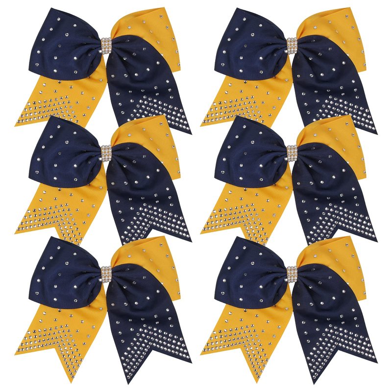8 Inch 2 Colors Cheerleader Bows Ponytail Holder with Bling Fling Rhinestones Hair Tie Cheerleading Bows 6 Pcs (Navy Blue/Yellow Gold)