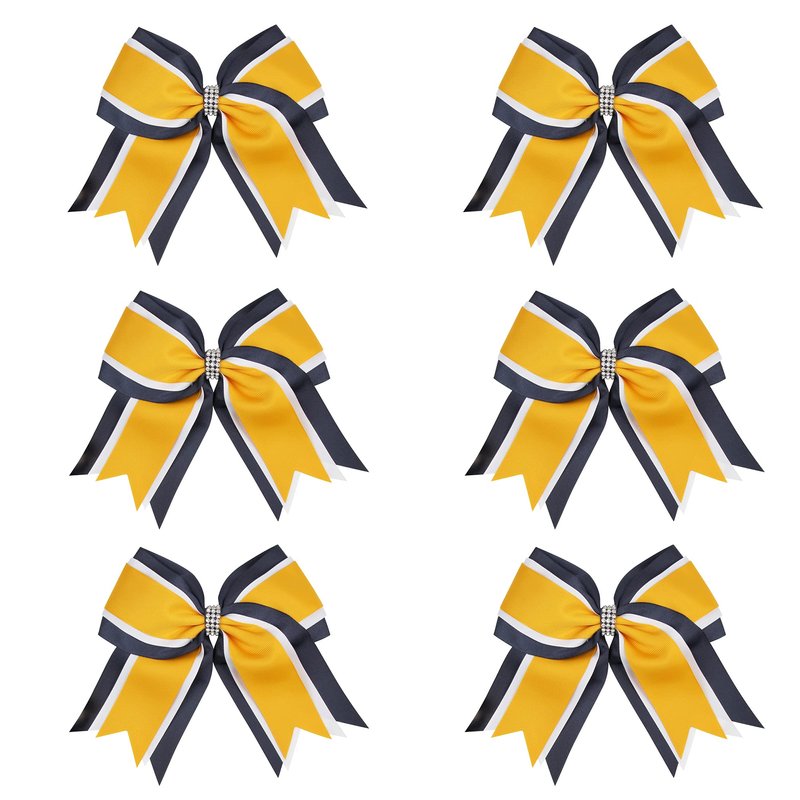 8 Inch 3 Colors 3 Layers 6 Pcs Cheerleader Bows Jumbo Cheerleading Bows Hair Elastic Hair Tie for High School College (Navy blue/White/Yellow gold)