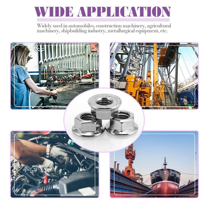 Product features: A flange nut is a nut with a wide flange at one end and can be used as an integrated non-rotating washer. This is used to distribute the pressure of the nut on the parts to be fixed, thereby reducing the chance of damage to the parts and reducing the possibility of loosening of the parts due to uneven fastening surfaces. The flange can be serrated to provide a locking effect. The serrations are angled to prevent the nut from rotating in the direction of loosening the nut. Because of their serrations, they cannot be used with washing machines, nor can they be used on surfaces that cannot be scratched. The serration helps to avoid vibration of the nut and increase the retention of the nut. Fine thread pitch: 1.25mm is made of 304 stainless steel, with strength and good corrosion resistance. Used in many applications in the home, farm, business, automotive and industrial fields.---The video in the picture is a real product taken by me.