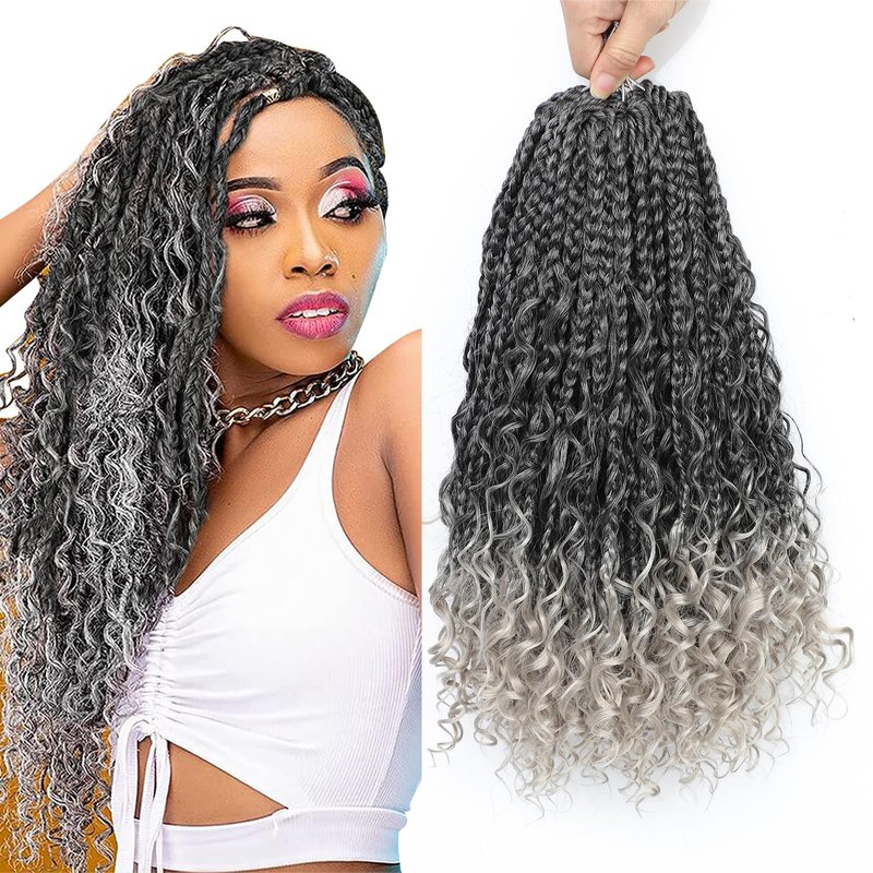 8 Packs Box Braids Crochet Braids Curly Ends 3X Box Braids 14 Inch Ombre Synthetic Crochet Hair Extensions (14 Inch, 1B/Silver)