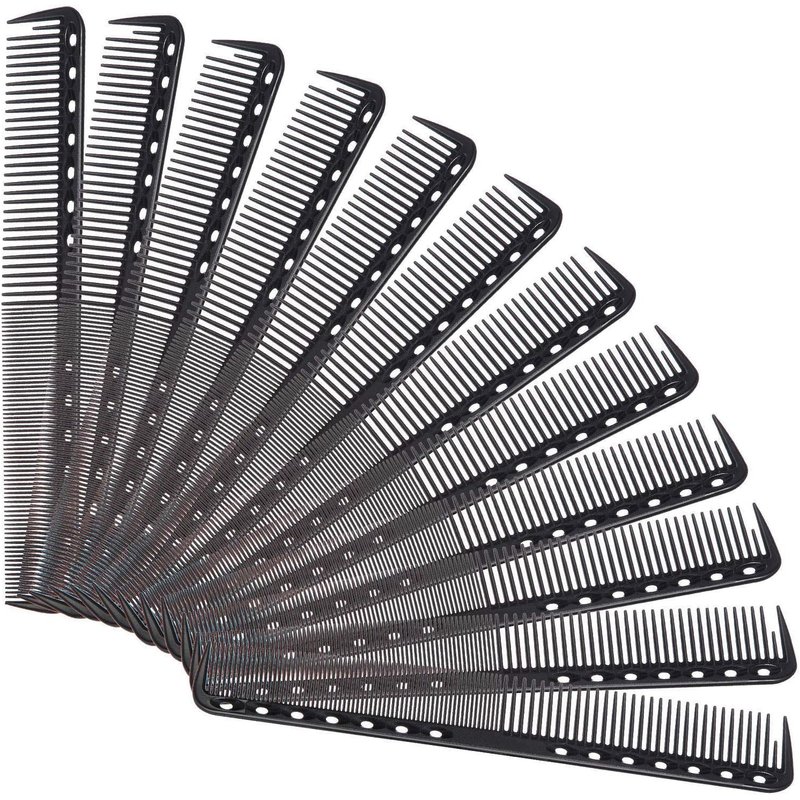 Features: Practical design: Each comb has 14 holes, the holes act as a measuring device, it has finely spaced and standard-spaced teeth to grip even the finest of hair well, a half-length first tooth which makes it easy to pick up sections and create partings. Features: Black carbon fine cutting comb, heat-resistant and anti-static, our cutting comb features a finely spaced and standard-spaced teeth design and the carbon sanded feel made for heat resistance and preventing static. Specifications: Color: as pictures shown Size: 18 x 2.5 cm/ 7.1 x 1 inches Material: carbon fiber Package include: 8 x Black carbon fine cutting combs.