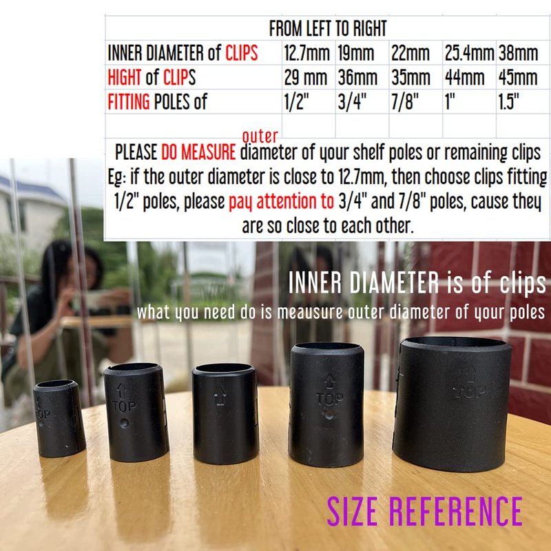 NOTE: 1 set required for 1 shelf, 1 set means 4 pairs of shelf clips, package contains 2 sets(8 pairs). These are solid plastic 38mm( inner diameter) shelf clips to help you secure 1.5" wire shelving to wire shelving posts, preventing shelf from sliding downward,or as replacements for your lost, broken, or worn-out clips. What you need to do is meaure the OUTER DIAMETER of your POLES, if it is very to close 38mm, then you could choose this,there are shelf posts of different sizes, so make sure you measure your remaining ones or poles before purchase, please find the closest one,we have diameter of 1/2"(12.7mm),3/4"(19mm),7/8"(22.2mm),1"(25.4mm),1.5"(38mm) available for you to choose, for better references of specific size between them, please look at the pictures.