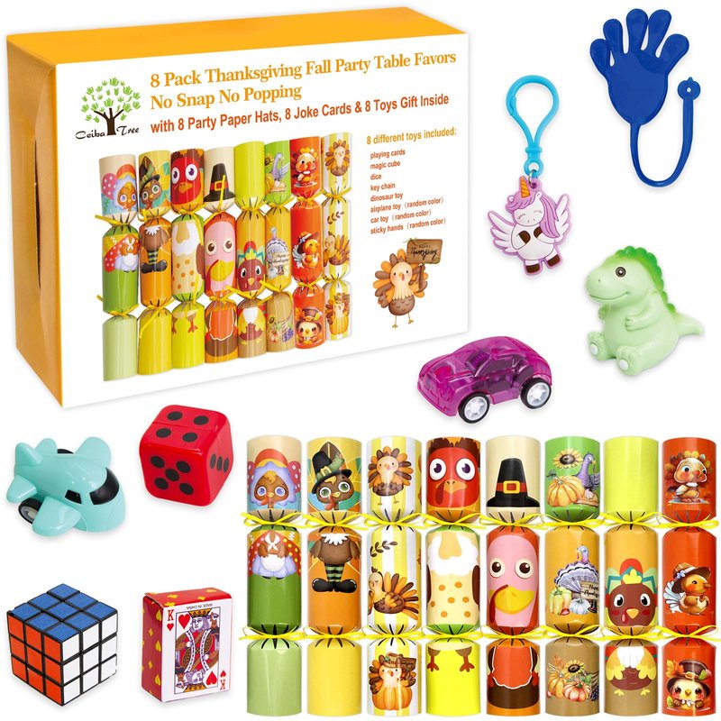 - What you get: 8 PCS Thanksgiving crackers poppers, no snap no popping, with party hats & joke cards , 8 PCS different toys prefilled, for kids gift, party table favors
