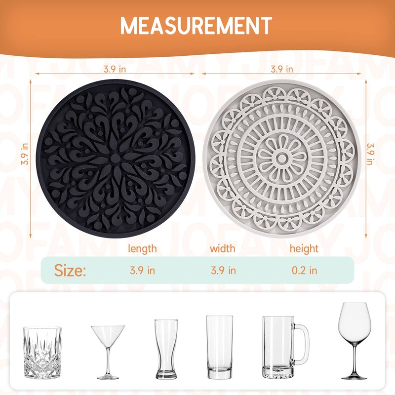 - Aesthetic & Practical: These coasters for drinks top has exquisite pattern groove, to contain leaking fluid and to prevent it to stick to glasses or bottles. 4-inch (10cm) diameter rubber coasters fits all types of glasses, cups and beverage containers, such as beer, children's drinks, sports beverages, cocktails, wine, whisky, ice water etc.