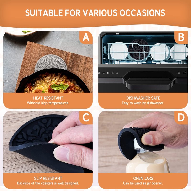 - Made of Premium Quality Silicone: Our 8 Packs drink coasters are made of high-quality silicone, great heat resistance ranging from 40F to 480F, anti-slip bottom and non-stick top.