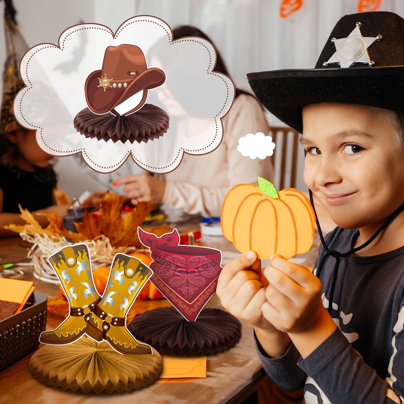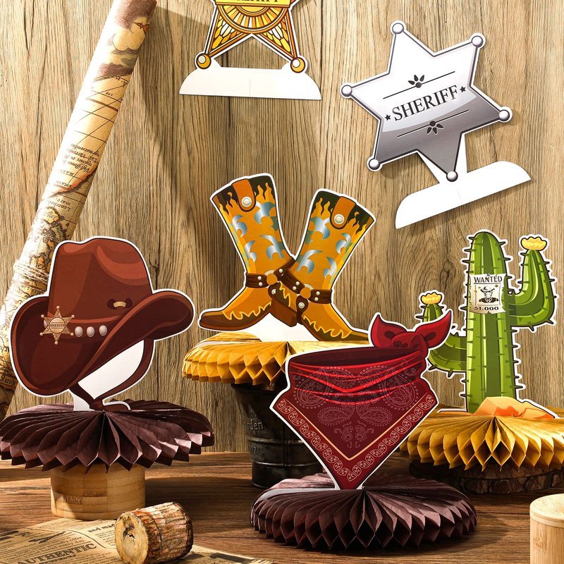 - Western Cowboy Theme Design: the western table decor is designed with honeycomb base and diverse western cowboy themed elements, including cactus, cowboy hats, stars, boots, bull skulls, etc., making your party look charming and creating a pleasant party atmosphere