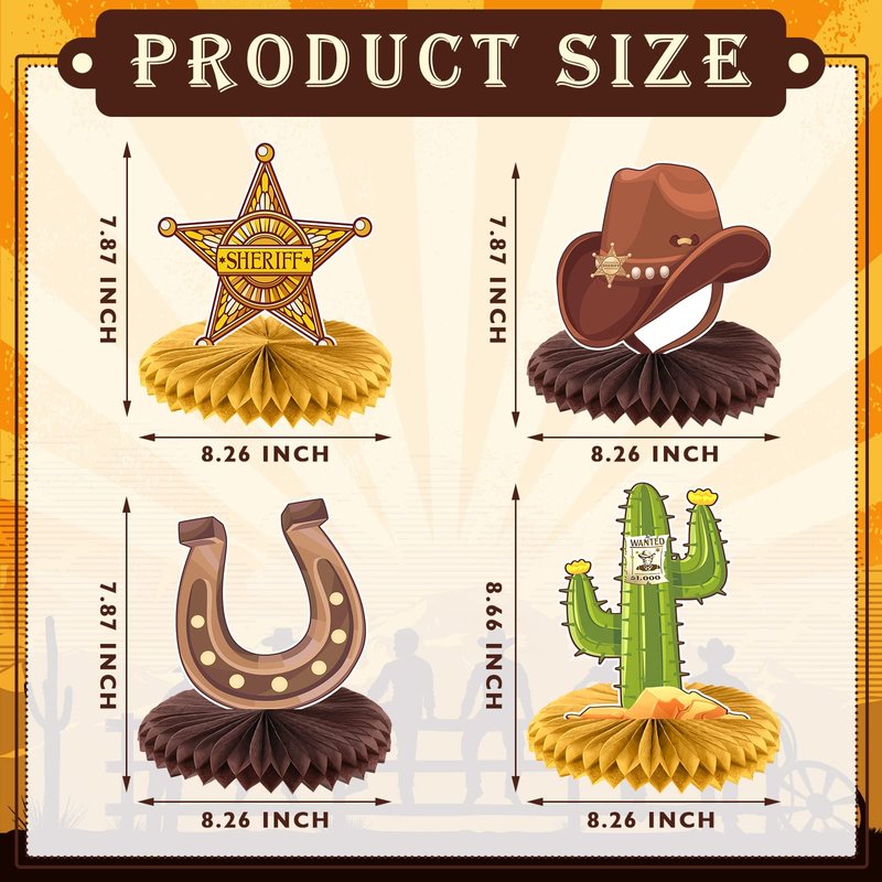 - Simple to Assemble: the western theme centerpiece is easy to use, just need to peel off the sticker in the center of the cowboys desk decor, attach the honeycomb ball to the bottom of the card and secure it, then gently unfold the honeycomb ball, and you get a complete and beautiful cowboy themed honeycomb table decor