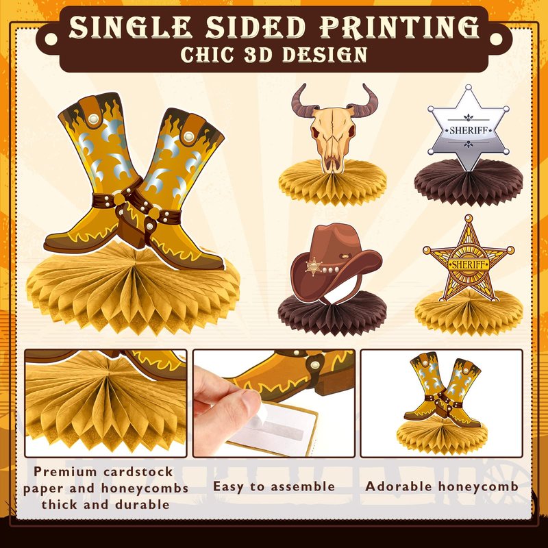 - Nice Workmanship: the Cowboy Party Honeycomb Centerpieces for party are mainly made of quality cardboard, which is strong and reliable to use, featuring clear print and nice workmanship, not easy to tear or fade, adding charm to your parties
