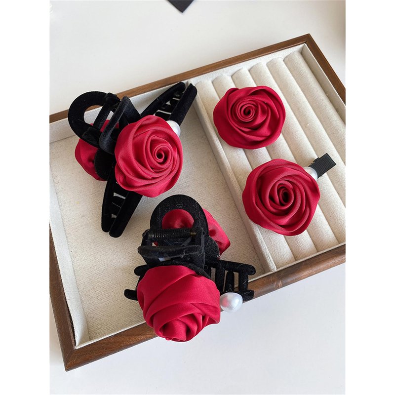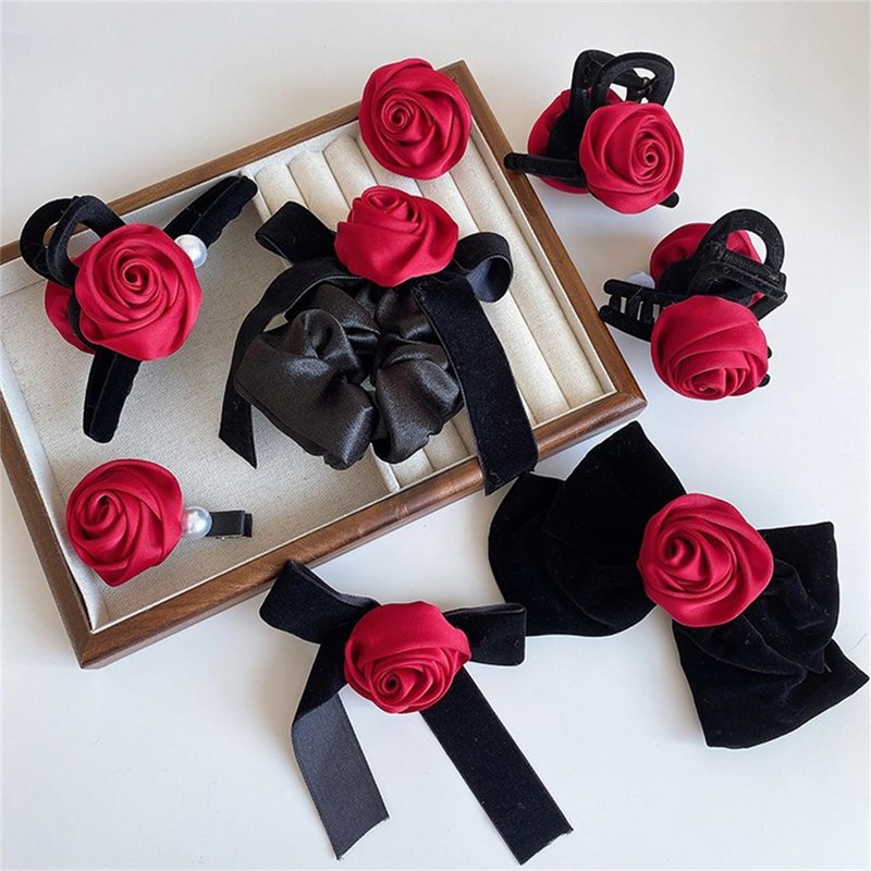 7 PCS Rose Hair Claws Hairpin Brooch Set Red Silk Floral Bow Clips Hair Rope Clamps Barrettes Clamps Hair Accessories for Women Girls 072