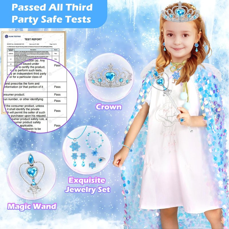 - Snow Dress Up Clothes Set: Princess dress up clothes for girls 4-6 designed for all little princess girls includes 1* glitter princess cape, 1* crown, 1* necklace, 1* bracelet, 2*rings, 1 * earrings and 1* wand. All little girls' dreams of becoming a beautiful princess will be satisfied by the overall snow design of toddler toys 3-8. Cute toys for 3 4 5 6 7 8 year old girls will be the gifts and toys that every girl looks forward to.