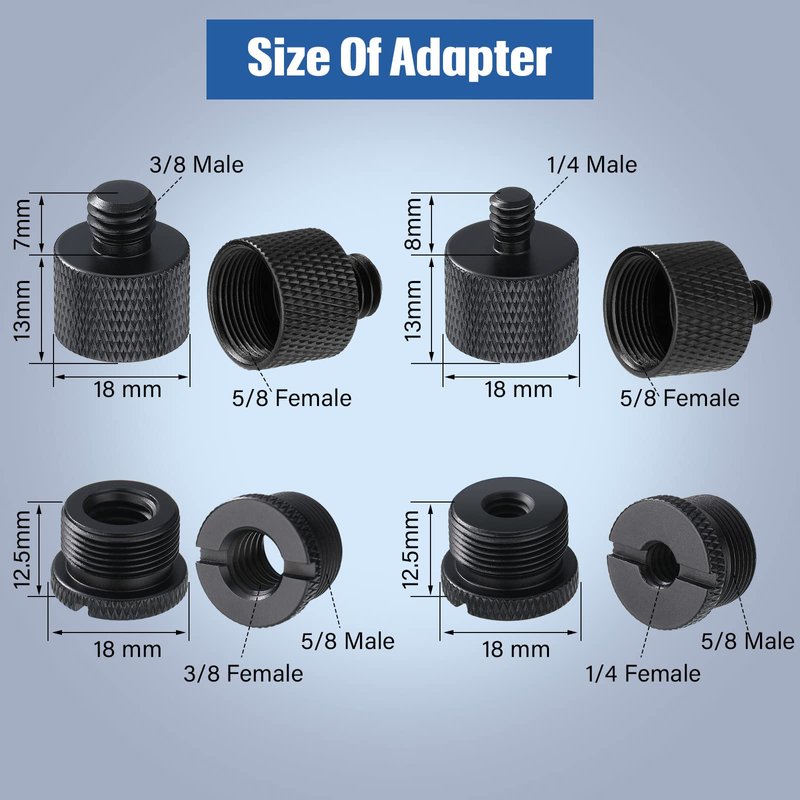 - 4 Different Adapters to Use: the mic stand adapters come in 3/8 female to 5/8 male, 5/8 female to 3/8 male, 1/4 female to 5/8 male, and 5/8 female to 1/4 male, working well with many types of mic stands, saving your time and effort