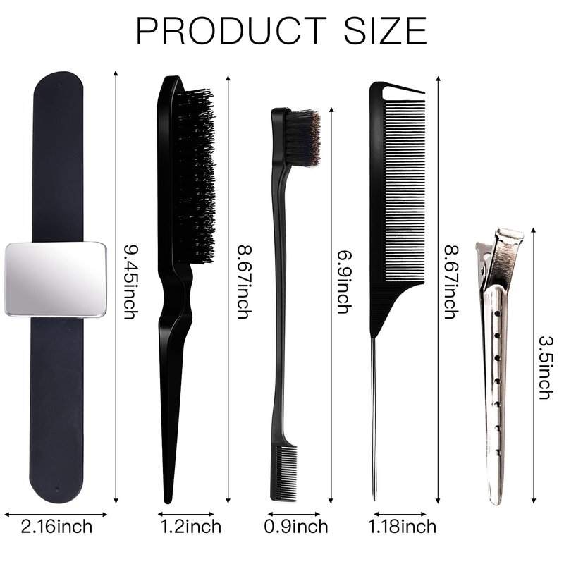 - Size Information: the wristband pin cushion holder is about 9.4 inches, the teasing brush is 8.7 inches, the edge brush is 6.9 inches, the pintail comb is about 8.7 inches, and the alligator clip is 3.6 inches.
