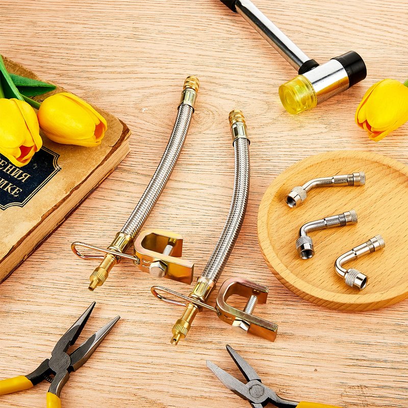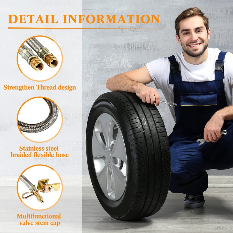 The dual tire valve extender is made of stainless steel and braided hose and the interface is made of thick copper, safe and air-tight. The tire valve extension is made of brass, and the surface is chrome-plated. It has good heat resistance and is not easy to rust, designed with high hardness.