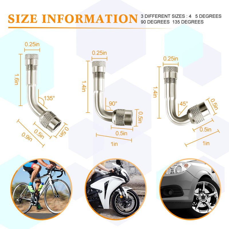 - Size details: each dual tire valve extension measures approx. 180 mm/ 7.1 inches in length; And the tire valve stem extensions with 3 different sizes are 45 degrees, 90 degrees and 135 degrees; Suitable size can be applied for different occasions; The specific size information is shown in the picture