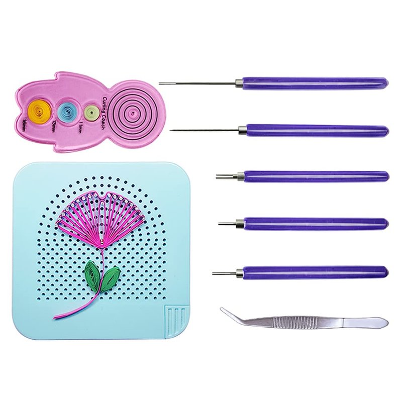 - 1. PACKAGE INCLUDED: You will get 1 Pc Quilling Knitting Board With Pin Storage Box, 5 Pcs purple slotted needle pens, 1 Pc curling coach,1 tweezers. Total 8 Pieces.