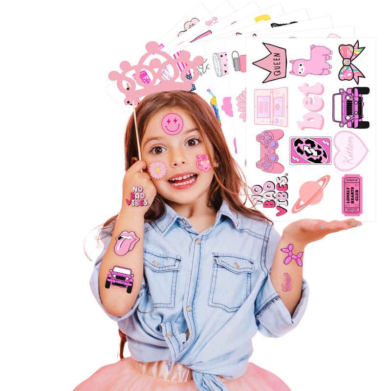 8 Sheet (96Pcs) Pink Pastel Temporary Tattoos for Girls, Birthday Party Decorations Supplies Party Favors Tattoo Sticker Style Sweet Gift for Kids Cute Prizes Themed
