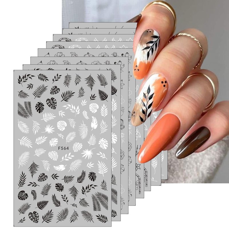 8 Sheets Black White Retro Flowers Nail Stickers, 3D Self-Adhesive Leaf Butterflies Pattern stickers, Fashion Simple Design Nail Art decals.