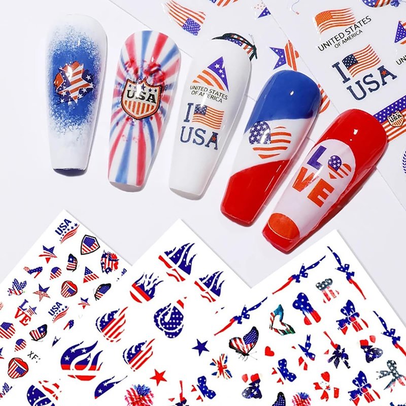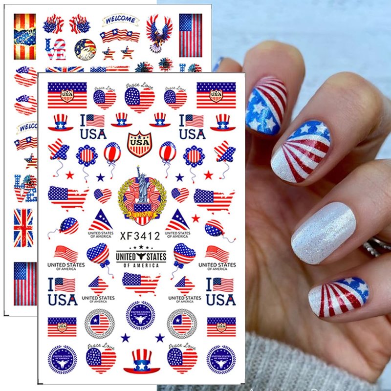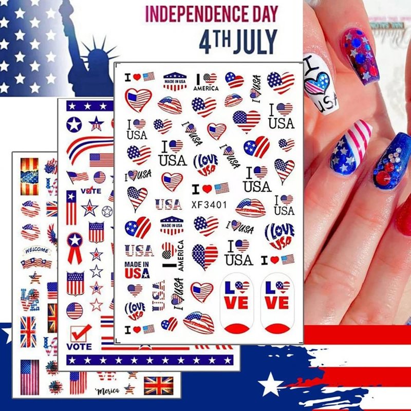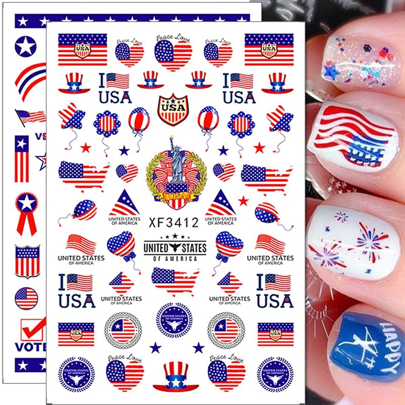 - Easy to use: USA Independence Day 3D designer nail stickers is self-adhesive and requires no glue, just remove sticker then stick this 3D nail decals on your nail. Apply top coat gel to seal to make the stickers last longer.