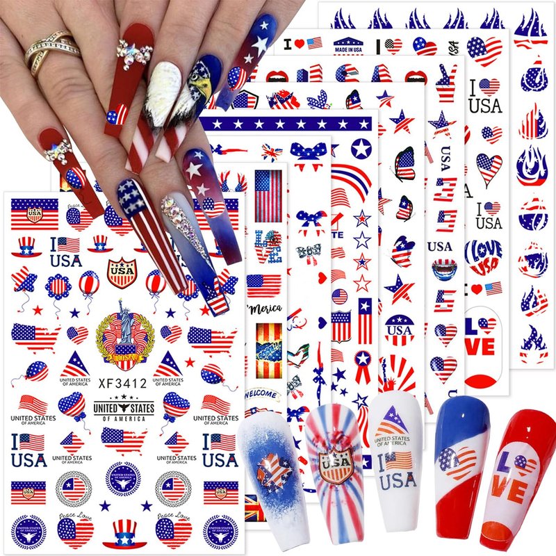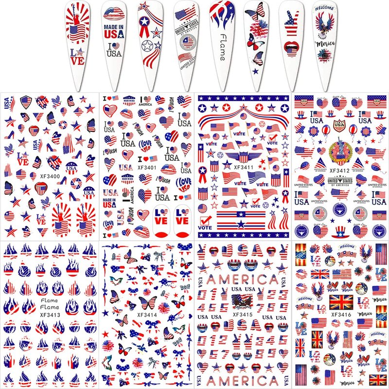 - Independence Day Nail Art: You will get 8 sheet American flag, flame, alphabet national emblem patterns with red,blue and white color. Variety of styles, you can find patterns you like and create your own 4th of July style.