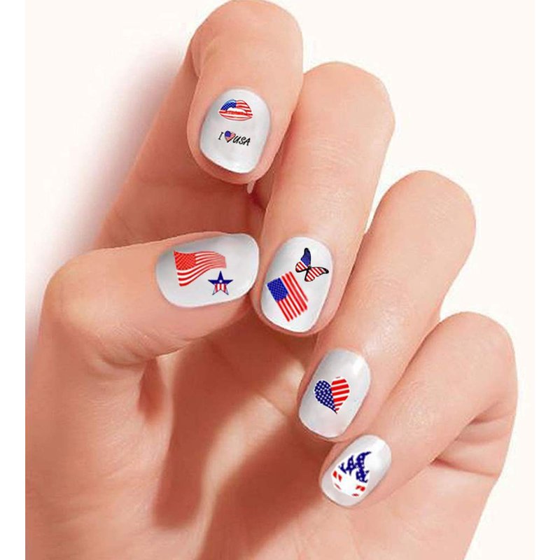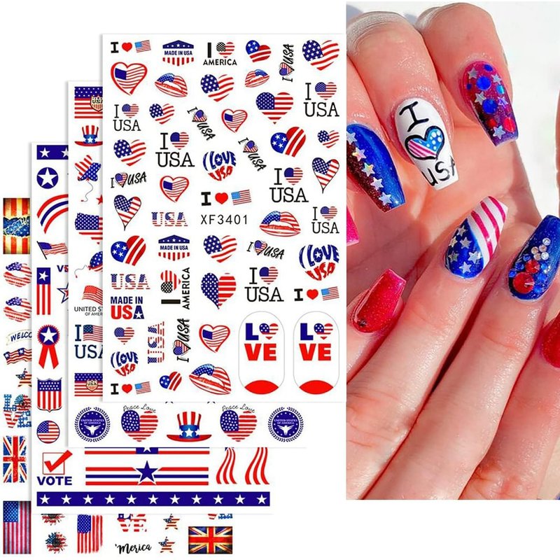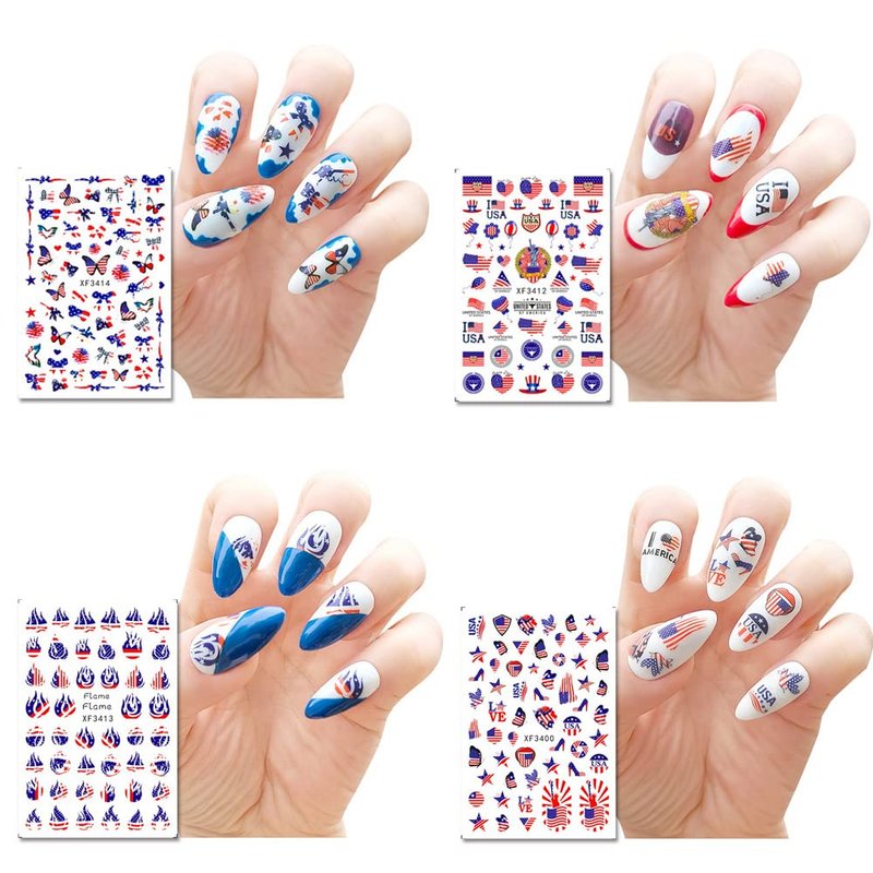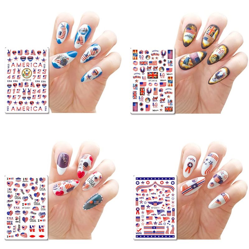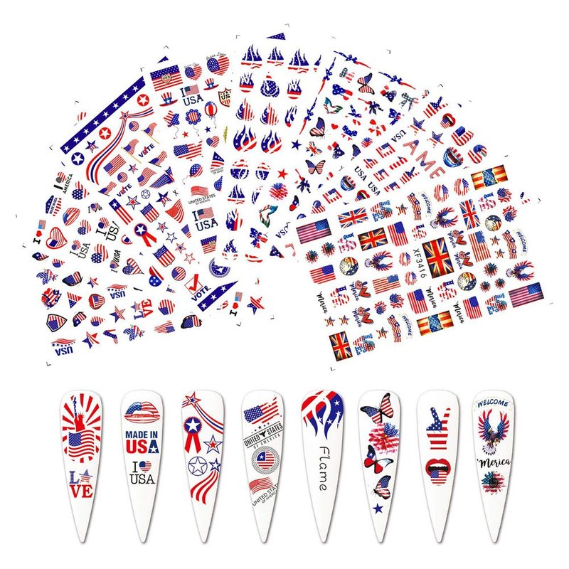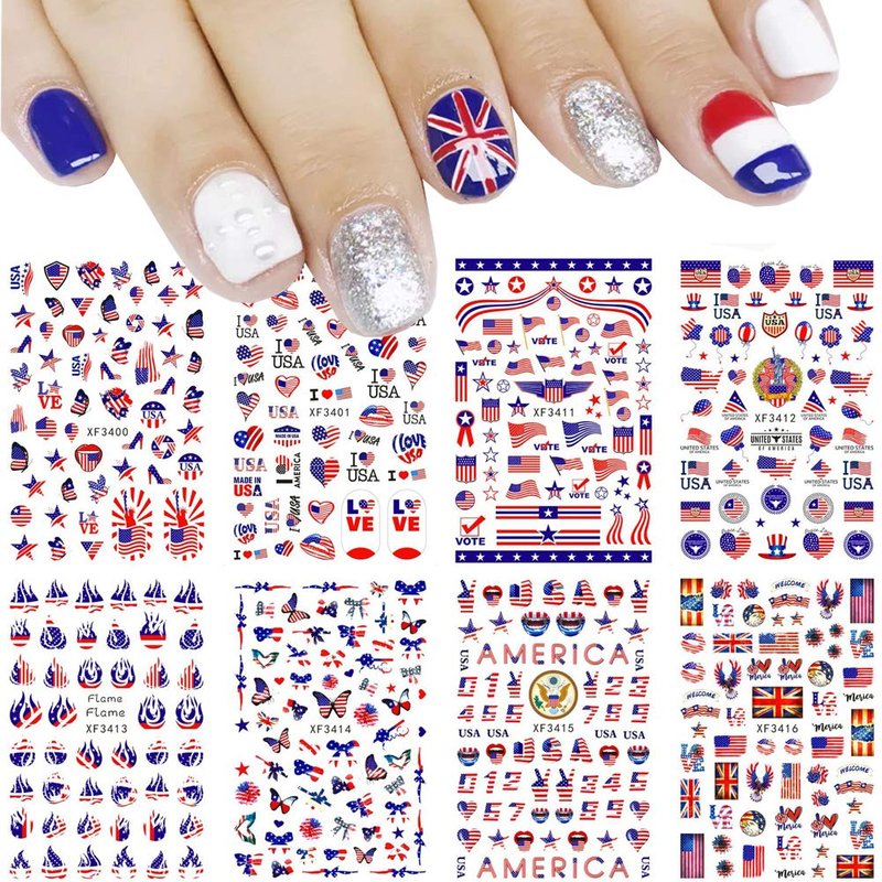- package includes: 8 Sheets self-adhesive nail art stickers. American flag is the holiday decoration you have been looking for + guaranteed to sell well! Each piece of paper has a different color and shape pattern to make your nails look elegant and unique