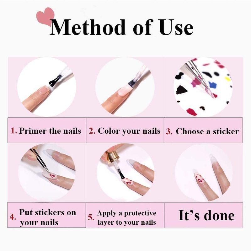 - Easy to apply: nail sticker cannot be transferred by water, and its self-adhesiveness makes it stick to the nail very well. You can also use nail polish to cover to make the sticker last longer