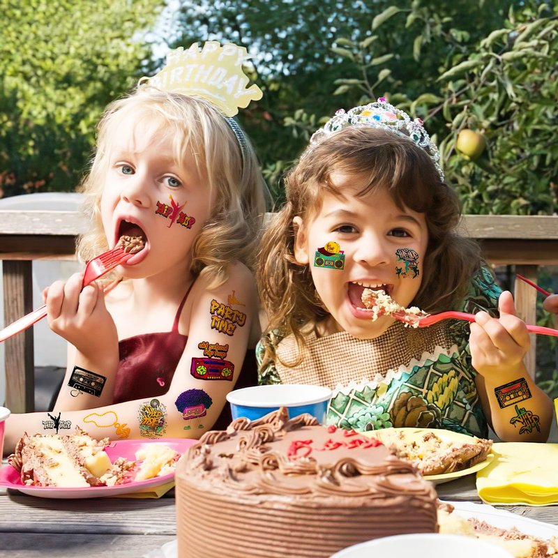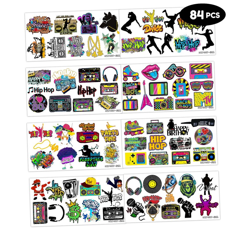 8 Sheets (84PCS) Hip Hop Temporary Tattoos 80s 90s Themed Birthday Party Decorations Supplies Favors Decor Stickers For Men Women Kids Gifts Classroom School Prizes Rewards