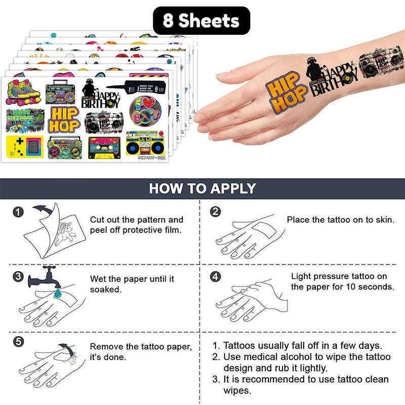 - 🎧HIP HOP PARTY : This particular tattoo set offers a total of 84 pieces, spread across eight sheets measuring 6.1 by 3.1 inches. The designs featured in this set are versatile and can be enjoyed by individuals of all ages. This product serves as an excellent gift option for special occasions such as birthdays, and can also elevate the aesthetic of party decor.