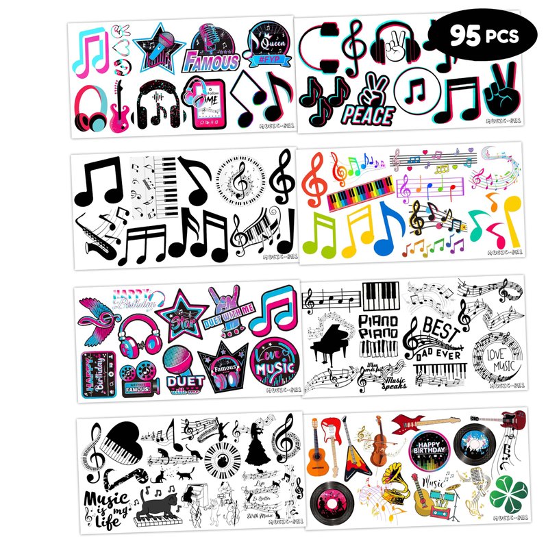 8 Sheets (95PCS) Music Temporary Tattoos Stickers Musical Note Black Theme Birthday Party Decorations Supplies Favors for Kids Girls Boys Gifts Prizes Rewards