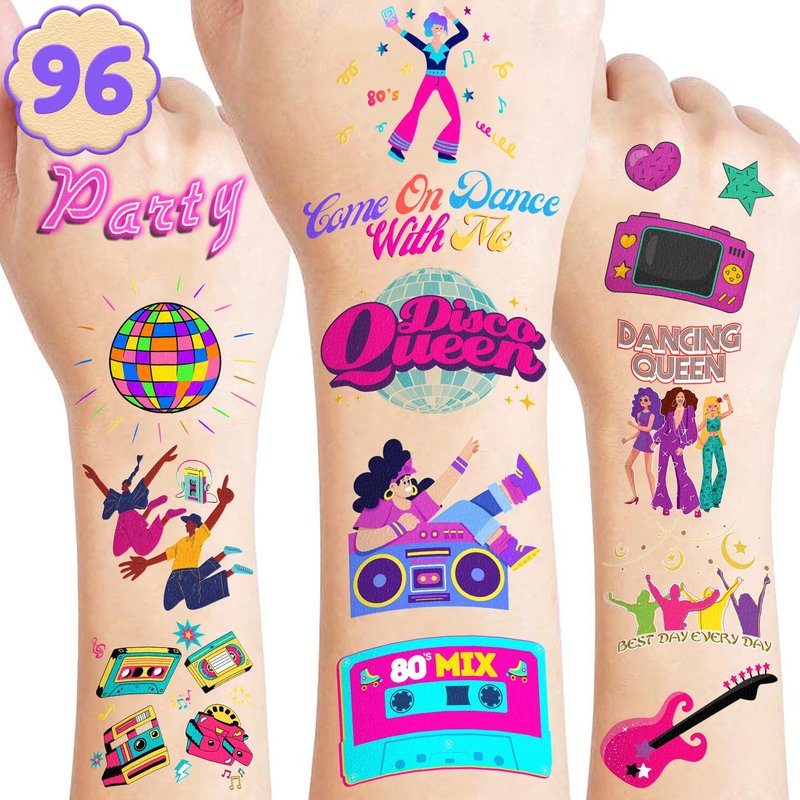 🎉【PERFECT TATTOOS FOR THEMED DISCO DECORATIONS】: Disco temporary tattoo stickers include 8 sheets in total. There are 96Pcs super cute tattoo differences. Perfect for giving out party favors and holiday theme small gifts. The size of each sheet is 6.1 * 3.1 inches. One size fits kids. 🎁【GREAT GIFT IDEAS FOR DISCO PARTY SUPPLIES AND DECORATIONS】: You will receive many compliments when you decorate your child's birthday party with a Disco theme. Disco tattoos are a small gift you should not pass up for your kids. 🌍【SAFE AND ENVIRONMENTALLY CONSCIOUS】: Our temporary tattoos are made from materials that are safe and prioritize sustainability. These tattoos are created using paper that is both safe for users and friendly to the environment. 🥳【ADD A TOUCH OF FUN】: Are you tired of mundane gifts? We've got you covered! Our collection of adorable and vibrant temporary tattoo designs can be applied to laptops, backpacks, desks, suitcases, books, water cups, and more. These playful elements will surely elevate your visual experience and bring a touch of joy to everyday items. 🎉 Disco Party Tattoos with Icon One for Everyone: 8 Sheets + 96 Tattoos! Our disco-themed temporary tattoos are a must-have for any party! With 8 sheets and a total of 96 tattoos, there's one for everyone—nobody gets left behind! :D Each tattoo features a unique design inspired by disco, music, the vibrant 70s, 80s, and 90s, disco queens, dancing queens, disco night parties, and all things retro and groovy. These tattoos are perfect for disco birthday parties, bridal showers, and they even add a fun touch to Christmas, Halloween, disco-themed school events, and baby showers! Caution for Sensitive Skin: Please Read!