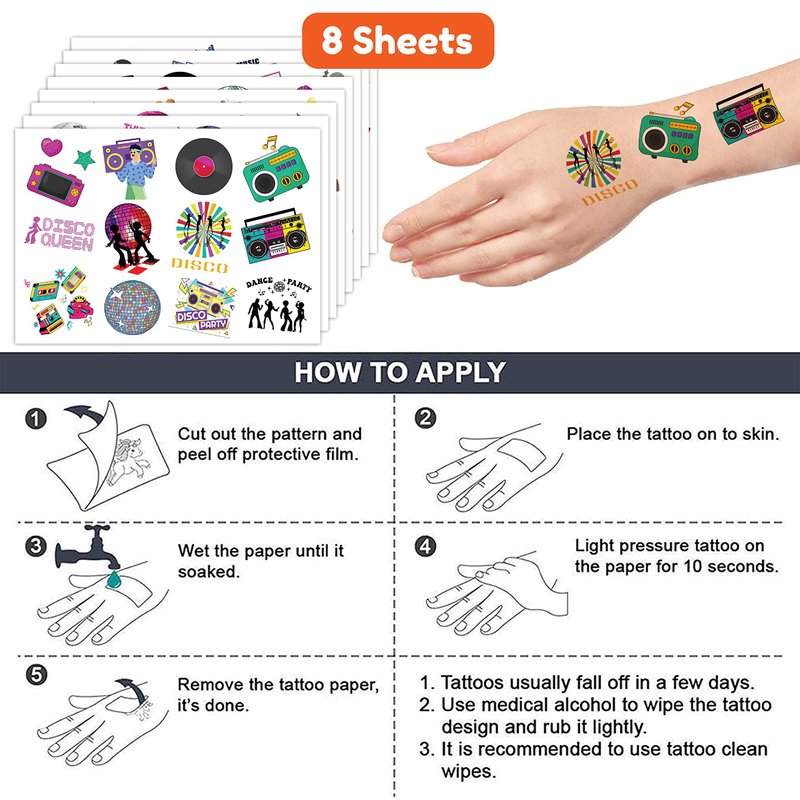 - 🎉【PERFECT TATTOOS FOR THEMED DISCO DECORATIONS】: Disco temporary tattoo stickers include 8 sheets in total. There are 96Pcs super cute tattoo differences. Perfect for giving out party favors and holiday theme small gifts. The size of each sheet is 6.1 * 3.1 inches. One size fits kids.