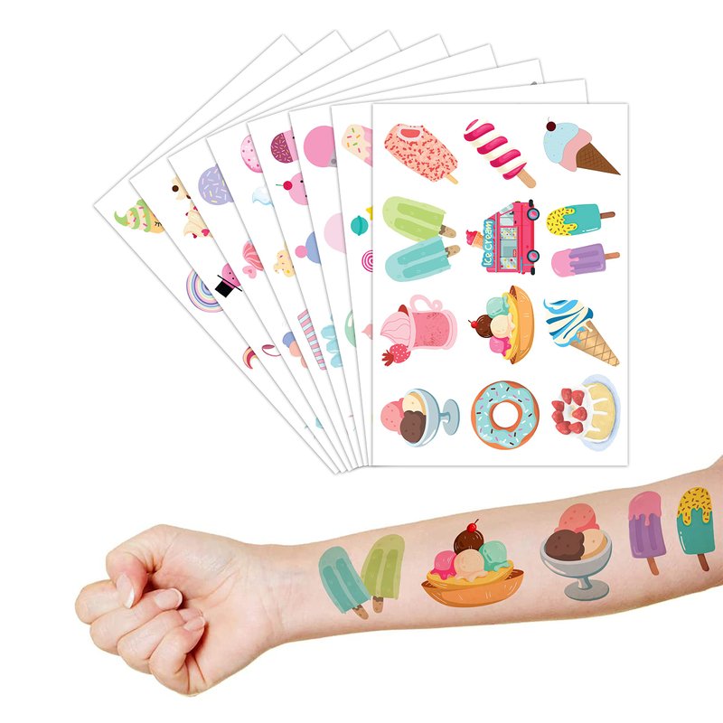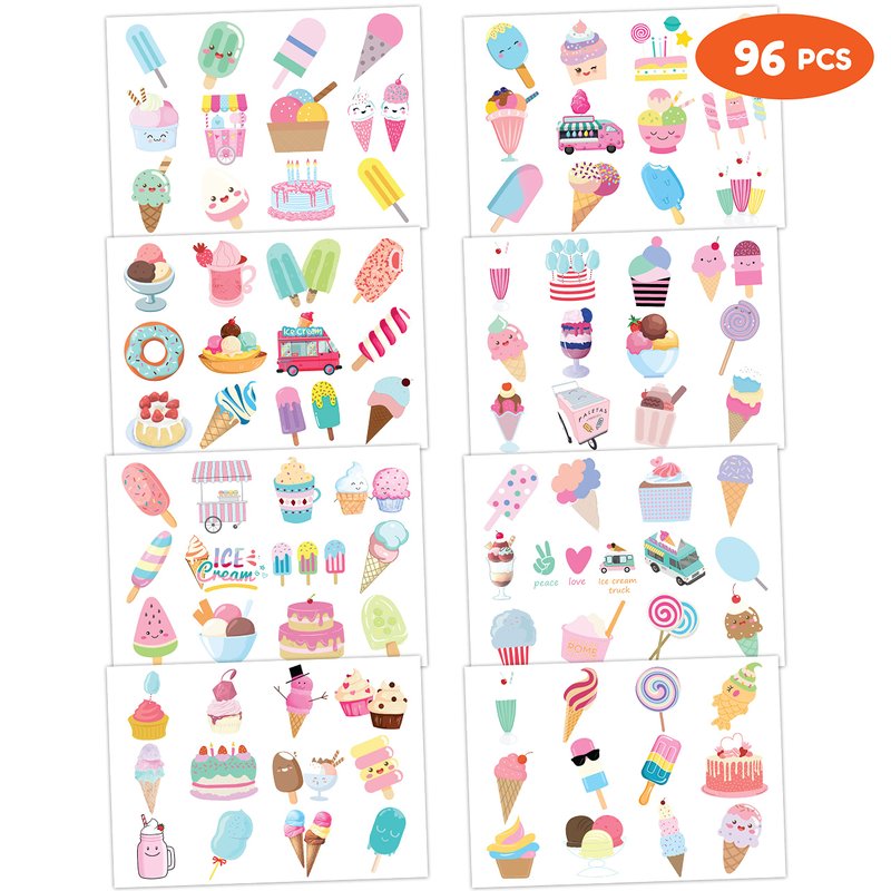 - 🍦【PERFECT TATTOOS FOR THEMED ICE CREAM PARTY FAVORS】: Ice cream temporary tattoo stickers include 8 sheets in total. There are 96Pcs super cute tattoo differences. Perfect for giving out party favors and holiday theme small gifts. The size of each sheet is 6.1 * 3.1 inches. One size fits kids.