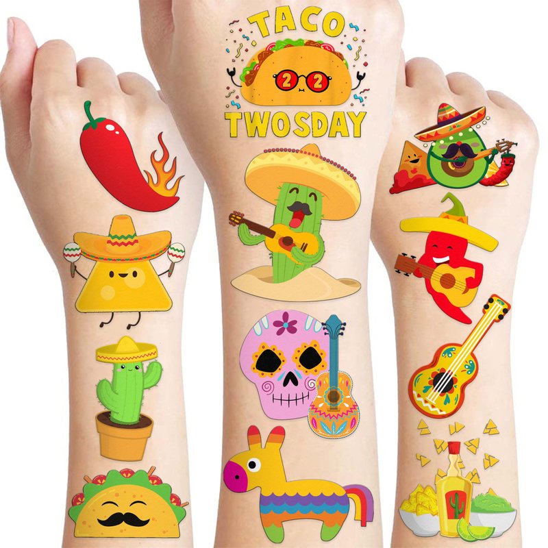 - TACO TWOSDAY BIRTHDAY PARTY : TACO temporary tattoos with the vibrant green, red and yellow color include cactus, avocado, guitar, llama, taco, chili and mexican food. These temporary tattoos are the must-have item in party, kids have no boredom at all that replaces with cheer plus excitement when you play with our tattoos^^