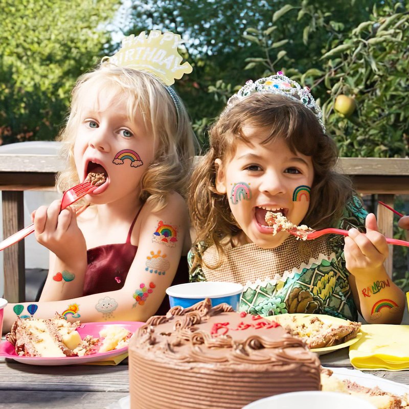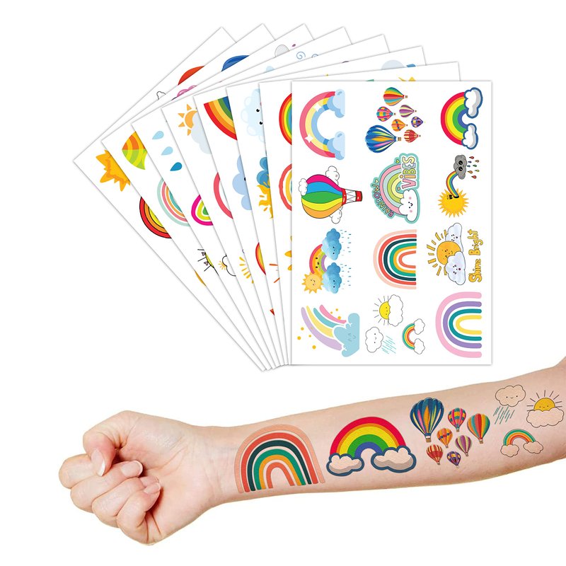 - RAINBOW PARTY SUPPLIES FAVORS: RAINBOW tattoos stickers cover various color tattoos with the emerging appearance of sunshine, rain, cloud, sky, and RAINBOW at all. Most of these nature patterns are to the point for holding Birthday party and outdoor party that will be reasonable choices for kids who have their hobby in nature things. During the moments of party, children have no boredom at all replaced with cheer plus excitement when they play with our tattoos^^