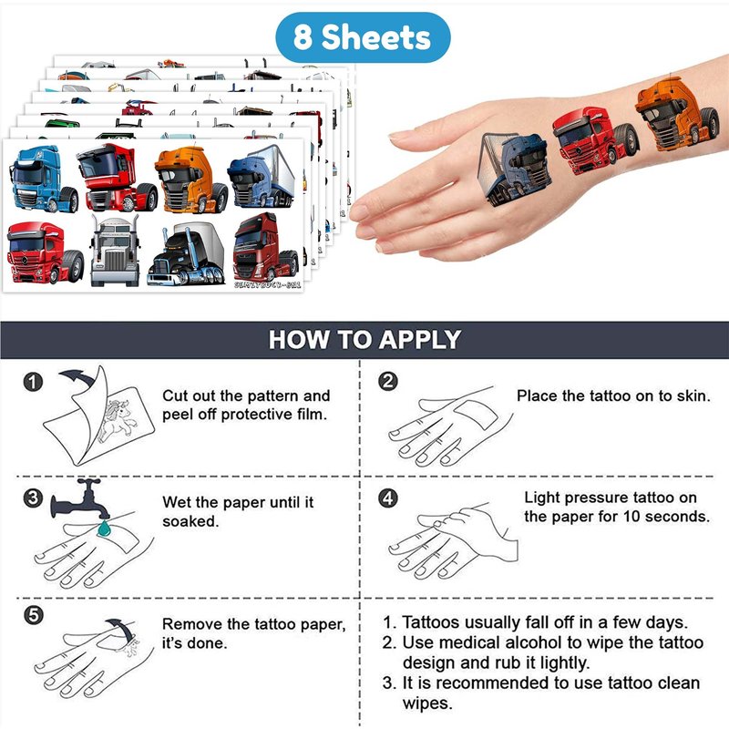 🚚PACKAGE INCLUDES: You will be provided with a set of eight sheets with 96 pieces that measure around 6.1 x 3.1 inches in dimension. With this package, you can make your special birthday celebration more delightful and cater to a gathering. This particular item would be an excellent choice to enhance the overall ambiance of your celebration, effectively capturing the interest and admiration of your attendees, and ensuring a memorable experience for all. 🚛SEMI-TRUCK PARTY DESIGN: If you're looking to add a touch of excitement to your semi truck party, consider incorporating these delightful tattoos into your decor. Each tattoo features a bold, eye-catching design inspired by trucks, which is sure to elevate the festive spirit and create a memorable experience for all in attendance. ♻️SAFE AND HIGH QUALITY: Our temporary tattoos are crafted with utmost care and precision using only the finest quality green and safety paper. This paper is made from non-toxic and ecologically safe materials, ensuring that our products are not only visually appealing but also safe to use. We take great pride in the quality of our tattoos and make no compromises when it comes to the safety of our customers. 📌USAGE: To begin, simply peel off the transparent paper from the sheet prior to cutting out the tattoo. Then, carefully apply it to a protected area like your hands, arms, or face, or even on surfaces like a glass, bag, water bottle, laptop, or phone case. Once applied, moisten the tattoo with a few drops of water, wait for 20-30 seconds, and then remove the backing paper. Voila! You now have a stunning velvety tattoo that can be easily removed with just water, soap, or baby oil. 💌CUSTOMER SERVICE: If you have sensitive skin, we advise against using this product. In case of any symptoms, please stop using it immediately. Our team is always here to help and make sure you have a positive shopping experience. Please do not hesitate to contact us for assistance.