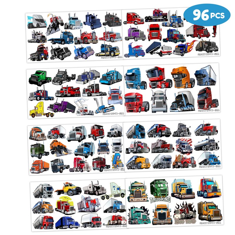 8 Sheets (96PCS) Semi Truck Temporary Tattoos Theme Birthday Party Decorations Supplies Favors Decor Stickers For Kids Boys Girls Gifts Classroom School Prizes Rewards