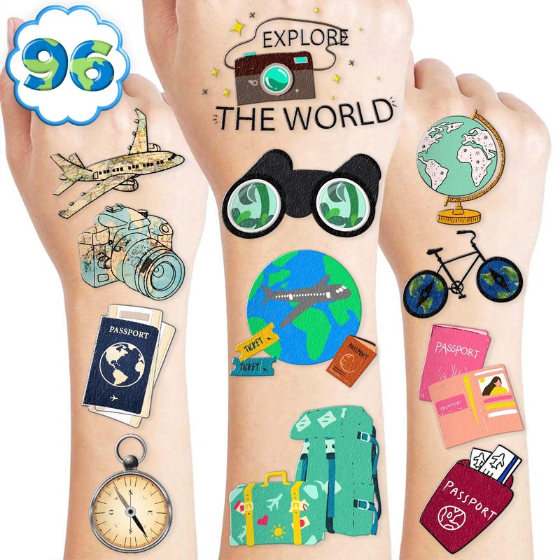 - TRAVEL THEME PARTY DECORATIONS: Your party will have the awesome experience all over the world if you choose our TRAVEL tattoo stickers. Travel tattoos collection include traveler costume, passport, suitcase, map, globe. You have no sadness at all replaced with excitement when you play with our tattoos