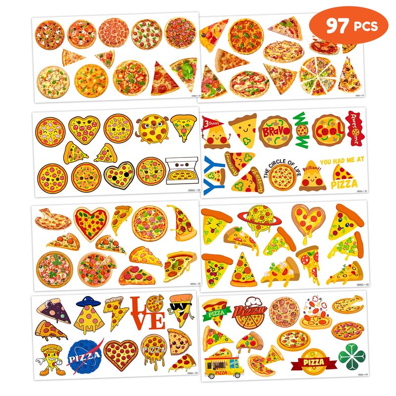 - Funny Cute Pizza Fast Food Birthday Party Supplies: 8 Sheets 96 PCS Pizza Fast Food Mushroom Cheese temporary tattoos stickers, Have a variety of cartoon themed characters, Children can easily Pizza Fast Food Mushroom Cheese stickers and take unique photos to make fond memories. The size of each sheet is 6.1 * 3.1 inches.