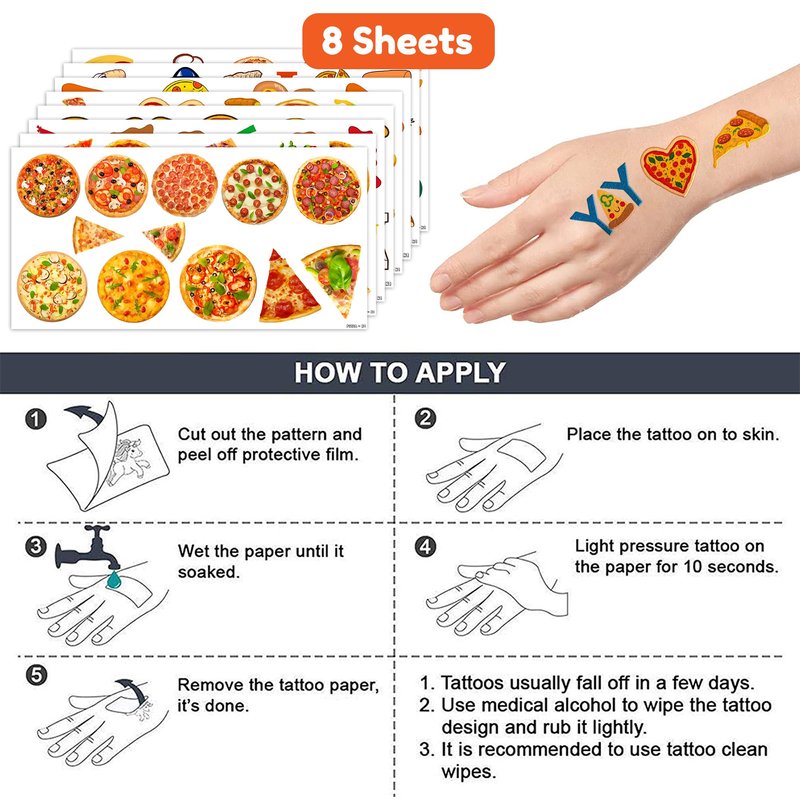 - Funny Cute Pizza Fast Food Mushroom Cheese Birthday Party Decoration: The set contains instructions for use and is easy to use. Fast food tattoo stickers can be applied on arms, face, hands, neck, shoulders, legs, wrists and ankles to make you look cool at all kinds of parties. Popular hit with your kids. You can apply them to your body or some smooth objects, for example, glass, stationery, paper, crafts cups, cabinet, bottle.