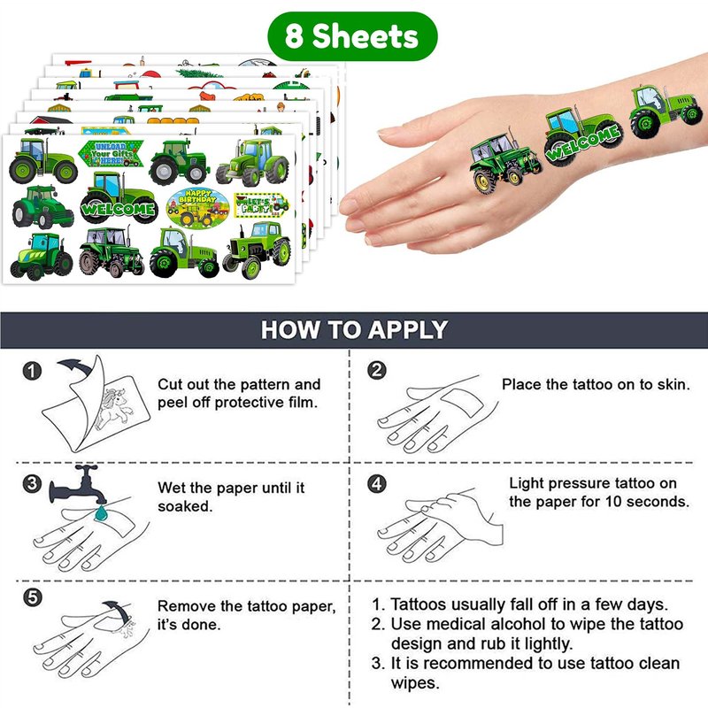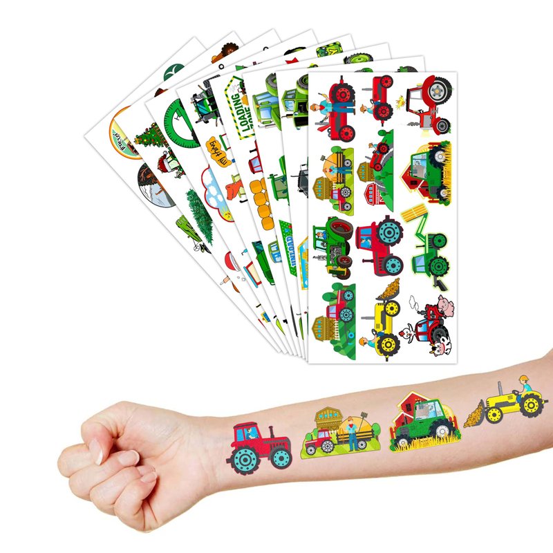 - TRACTOR BIRTHDAY PARTY SUPPLIES:Tattoo is the best gift for birthday party together with the significant meaning that it says and will accommodate your expectations at birthday party, party decorations, and special celebrations. Each tattoo set covers 8 sheets in total with 97 Pcs. The dimension of each sheet is 6.1*3.1 inches, including tattoo pieces that have proportions reasonable for adults to kids.Tattoo stickers designed in different styles promise to develop the impression for the party