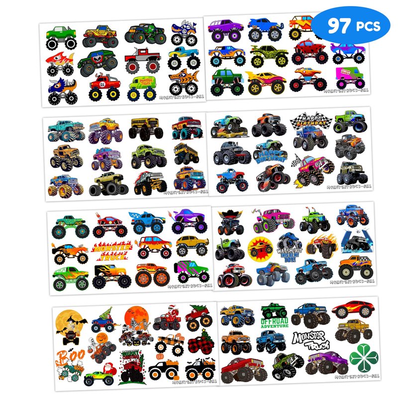 8 Sheets (97PCS) Monster Truck Temporary Tattoos Themed Birthday Party Decorations Favors Supplies Decor Stickers For Kids Boys Girls Gifts Classroom School Prizes Rewards
