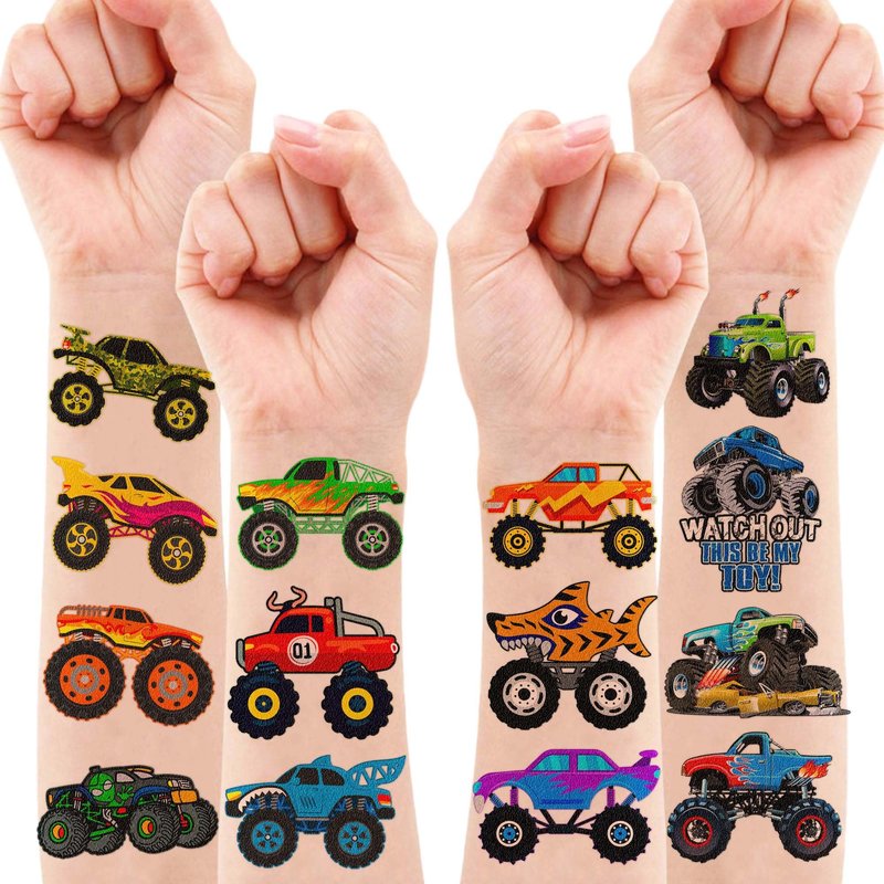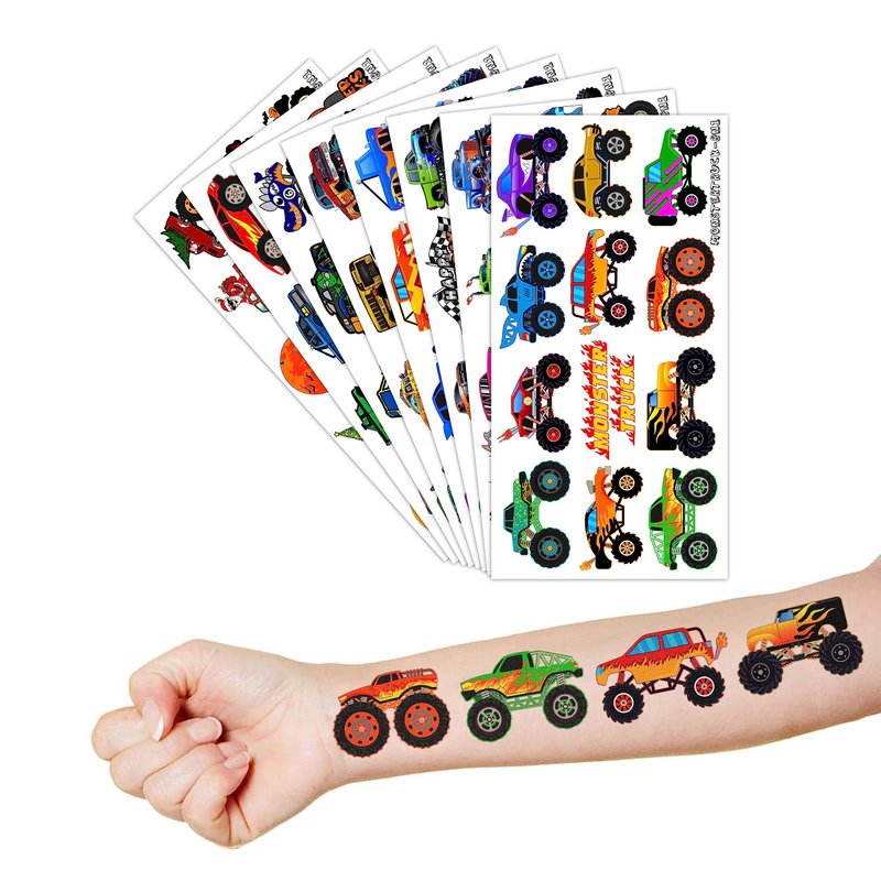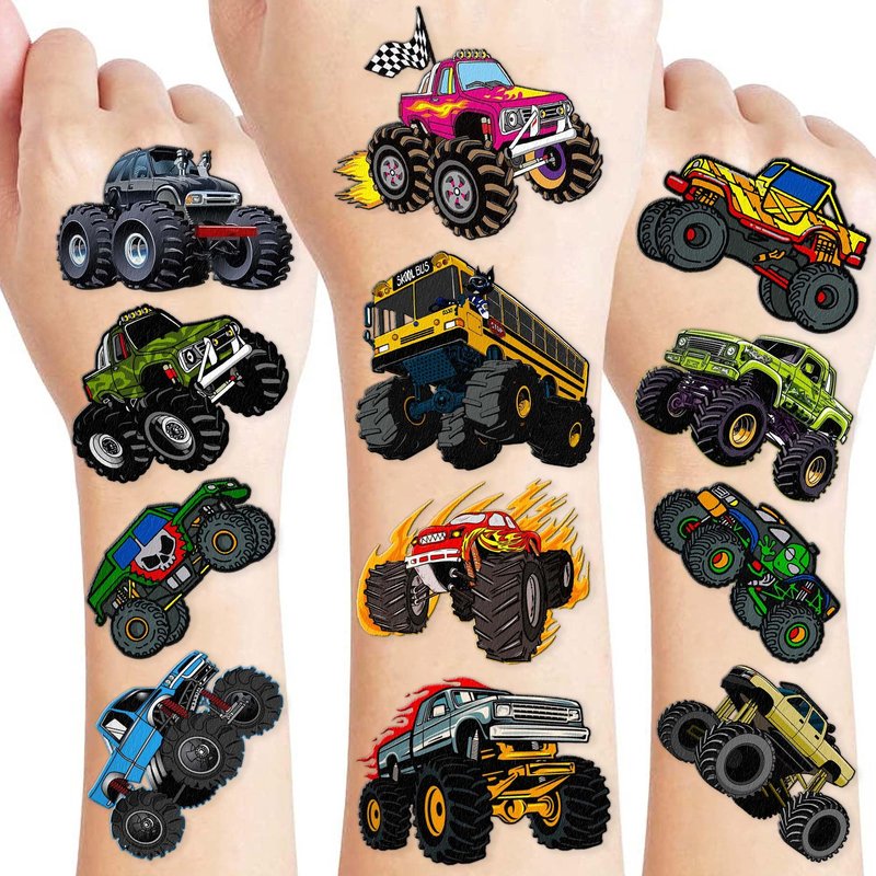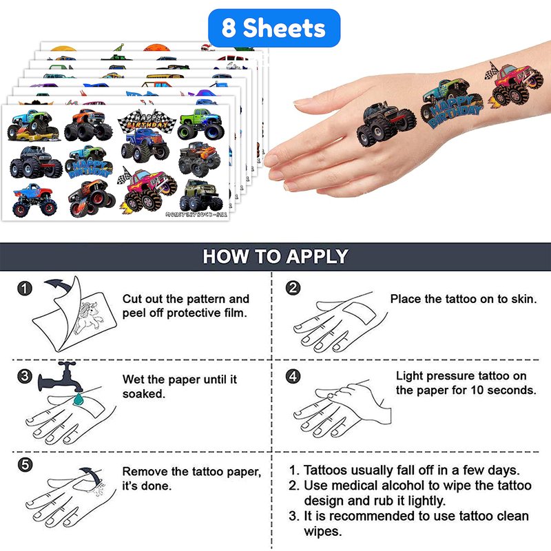 - 🛺MONSTER TRUCK TATTOOS:Tattoo is the best gift for a birthday party together with the significant meaning that it says and will accommodate your expectations at birthday party, party decorations, and special celebrations. Each tattoo set covers 8 sheets in total with 96 Pcs. The dimension of each sheet is 6.1*3.1 inches, including tattoo pieces that have proportions reasonable for adults to kids. Our tattoo stickers designed in different styles promise to develop the impression for the party