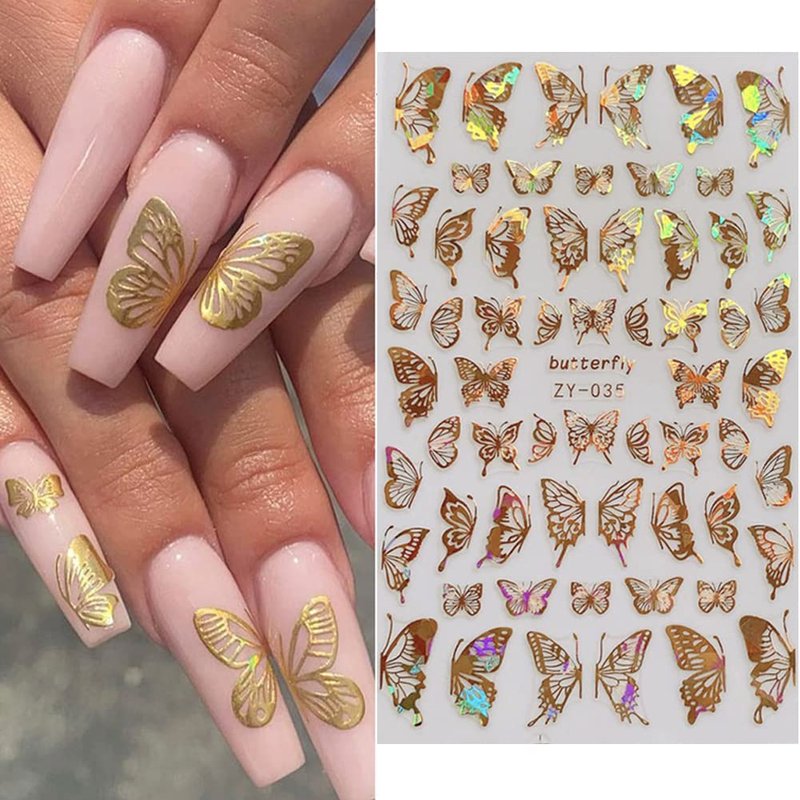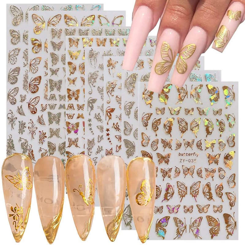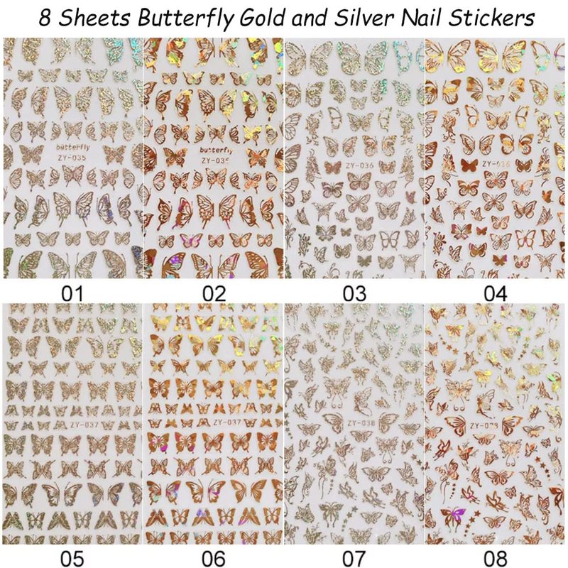 - Quantity: You will get 8 Sheets Holographic Butterflies nail art stickers, including many different colors, such as gold, silver, laser butterfly, etc. The size of each butterfly nail sticker is 4.7 x 2.9 inches
