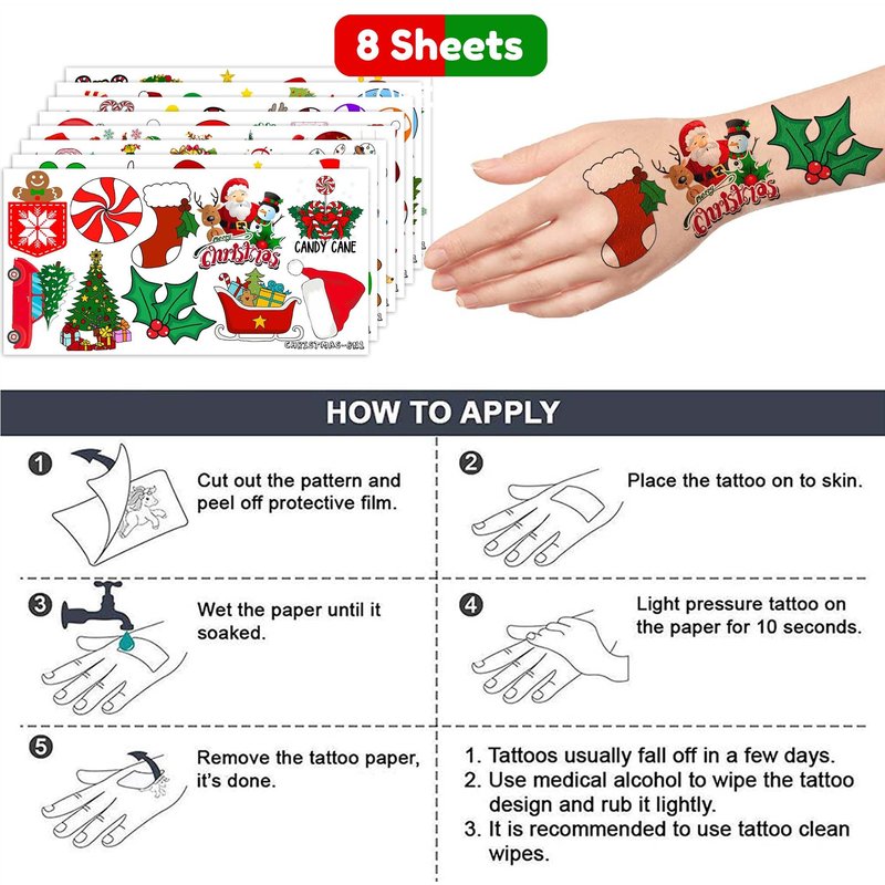 - 🎅CHRISTMAS TATTOOS FOR KID: Looking for fun and festive stocking stuffers for kids? Check out these temporary Christmas tattoos! With 8 sheets of different designs featuring Santa, a deer, a snowman, a penguin, a Christmas tree, and other holiday symbols, these tattoos are perfect for kids of all ages. Use them as normal tattoos, goodie bag fillers, or Christmas party favors for the little ones.