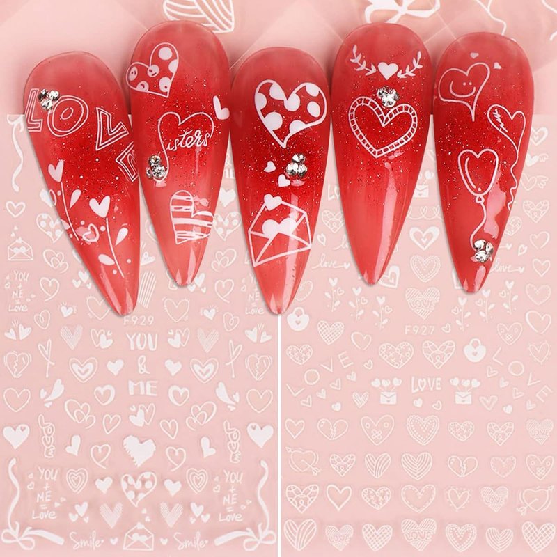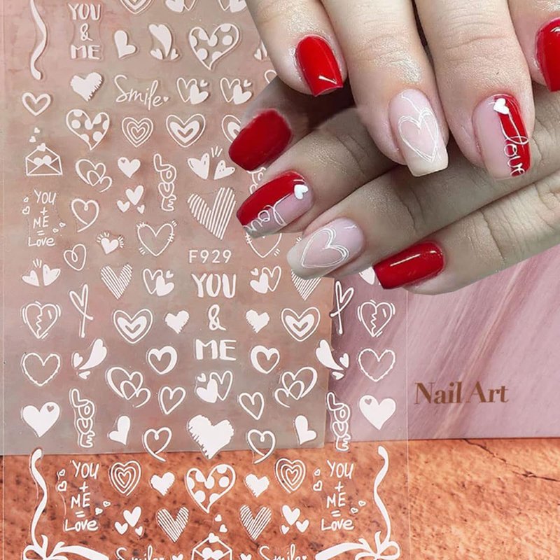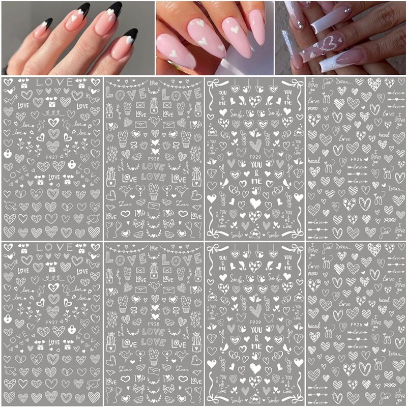 - Heart Nail Decor: This hearts nail art sticker set includes 8 sheets of heart nail stickers, special heart shape designs, with white colors, enough patterns bring you more nail DIY choices.