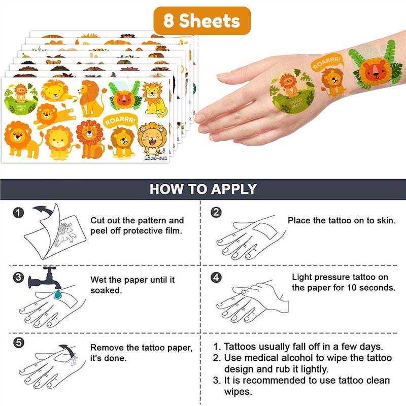 🦁PACKAGE INCLUDING: Our tattoo sheets are precisely measured at 6.1x3.1 inches, making them the perfect canvas for any design. With a vast selection of 79 different patterns available, you are guaranteed to find the ideal one for any occasion. This versatile decoration is perfect for baby showers, wild-themed birthdays, and events with a safari or jungle animal theme. 🦁Jungle Lion Party Decor for Kids: Are you planning a lion-themed birthday party for your children? If so, you won't want to miss the lion's birthday party materials collection! This collection includes everything you need to create a fun and festive atmosphere for your child's special day, including easy-to-assemble lion tattoos. Start planning your child's joyful celebration today! ♻️SAFE AND HIGH QUALITY: Our temporary tattoos are crafted with utmost care and precision using only the finest quality green and safety paper. This paper is made from non-toxic and ecologically safe materials, ensuring that our products are visually appealing and safe to use. We take great pride in the quality of our tattoos and make no compromises when it comes to the safety of our customers. 📌USAGE: Before removing the tattoo, it's essential to take off the clear paper from the sheet. You can choose any covered surface like your arms, hands, face, or objects like a water bottle, purse, laptop, or phone case to apply the product. Wait for 20 to 30 seconds, sprinkle a few drops of water on the tattoo, and take off the backing paper. You'll end up with a gorgeous, velvety tattoo that can be easily removed with baby oil, soap, or water. Go ahead and enjoy your stunning new look! 💌CUSTOMER SERVICE: If you have sensitive skin, we advise against using this product. In case of any symptoms, please stop using it immediately. Our team is always here to help and make sure you have a positive shopping experience. Please do not hesitate to contact us for assistance.