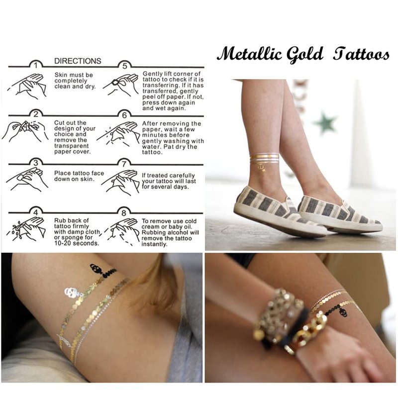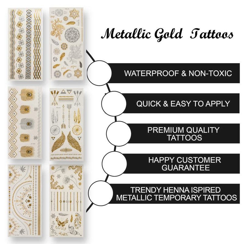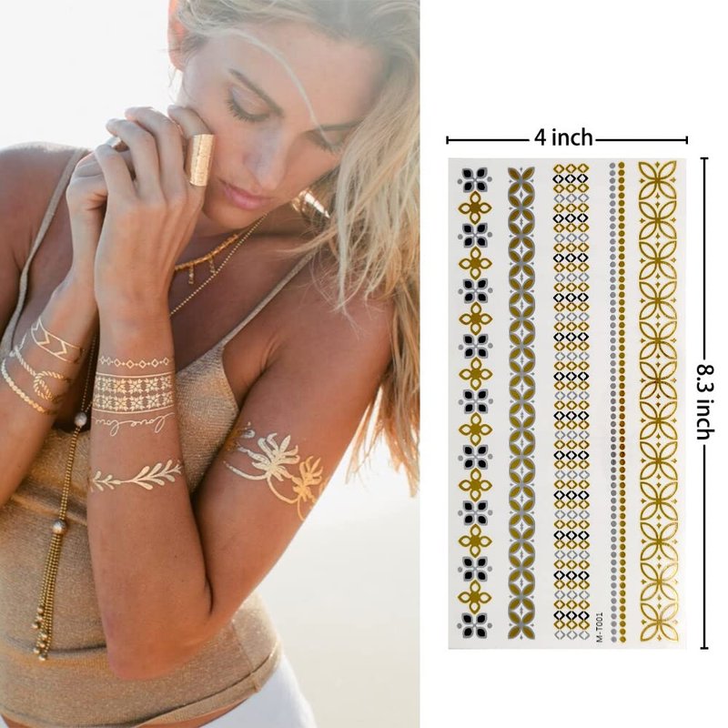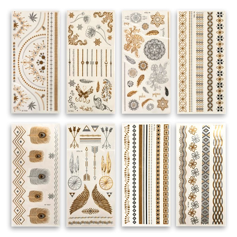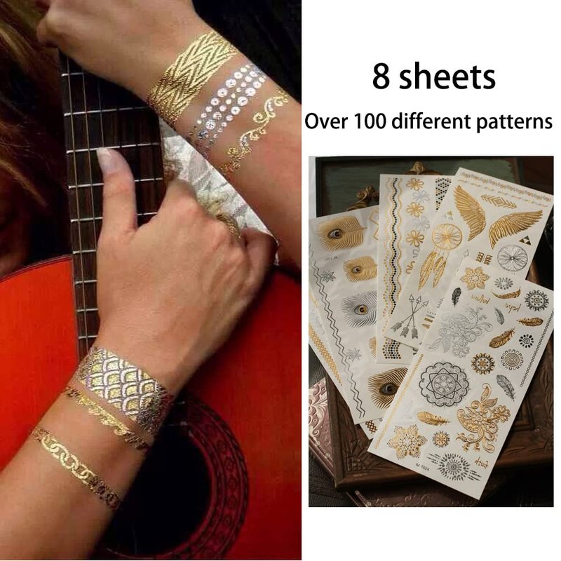 - GREAT QUALITY- 8 sheets (Over 100 different patterns) exquisite gorgeous gold tattoo designs. Fake tattoos use the latest temporary tattoo sticker technology. Ensure that the tattoo can stay on the skin longer and maintain very good integrity.