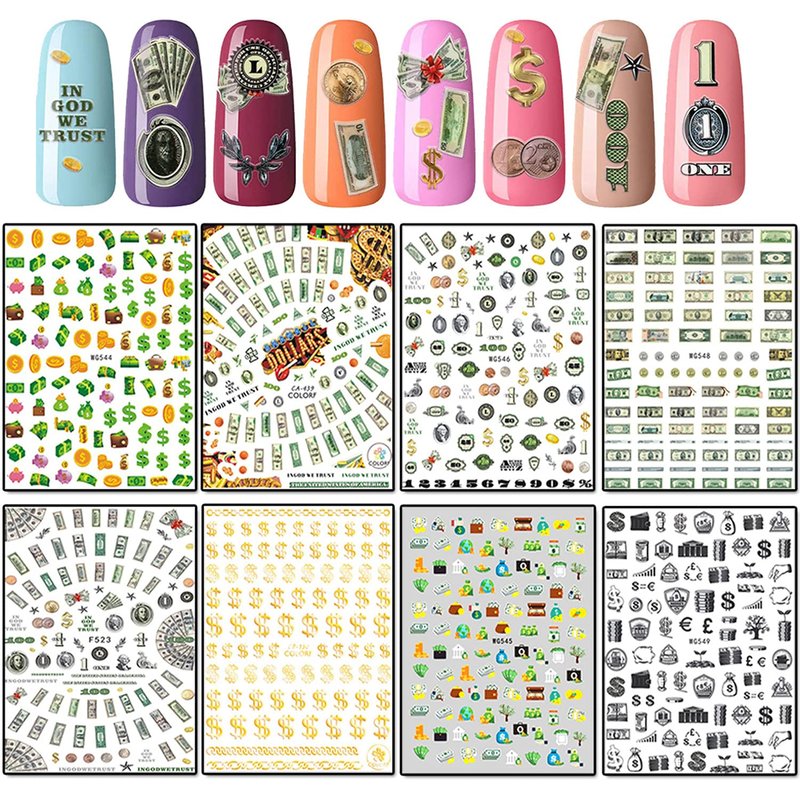- Quantity: 8 Sheets dollars nail art sticker, each paper measures 3.9 x 3.1 inches. These nail stickers contain a variety of patterns: gold coins, money bags, wallets, piggy banks, currency sign etc.