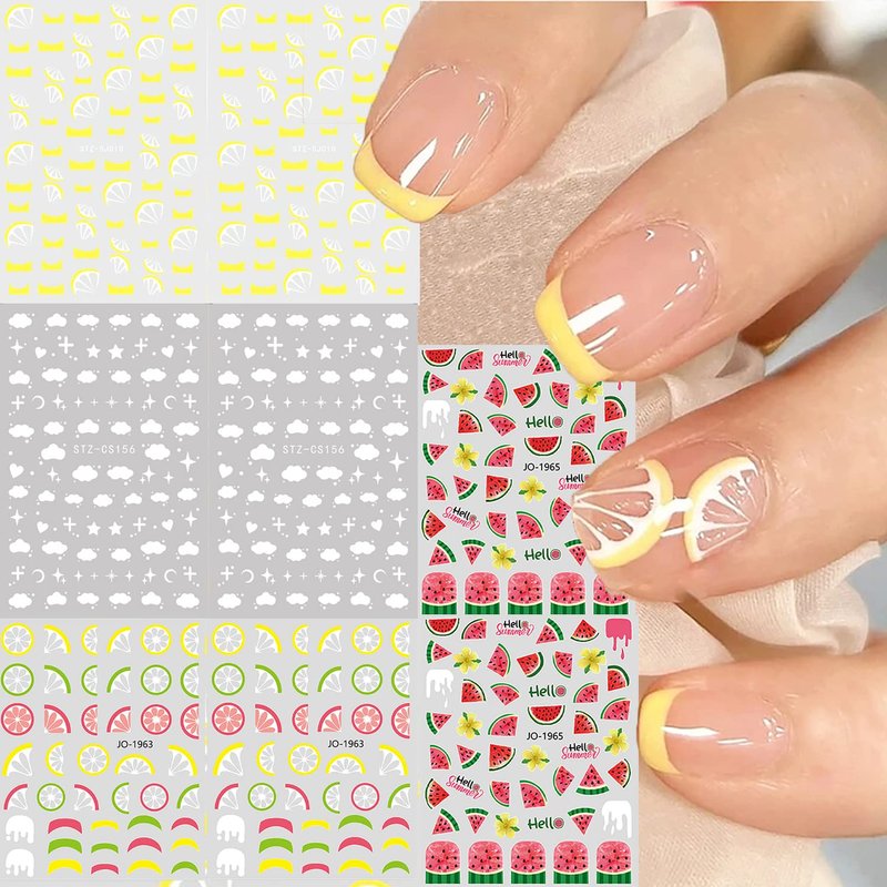 - Package: 8 summer nail stickers, 2 lemon petal patterns +2 cotton cloud patterns +2 watermelon patterns +2 colorful lemons.