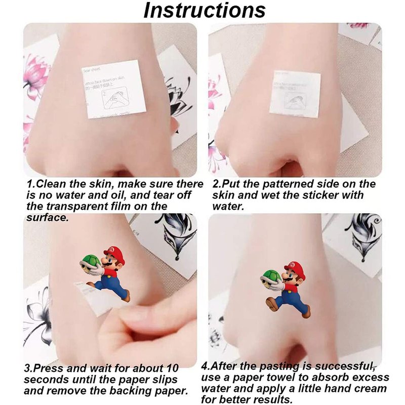 - š ćQuality and Quantityć: 8 Sheets Mario tattoos stickers, each pattern measures 6.1 * 4.3 inch, one size fit all adult and kids, cute cartoon style design create more fun in the party! Popular hit with your kids. You can apply them to your body or some smooth objects, for example, glass, stationery, paper, crafts cups, cabinet, bottle.
